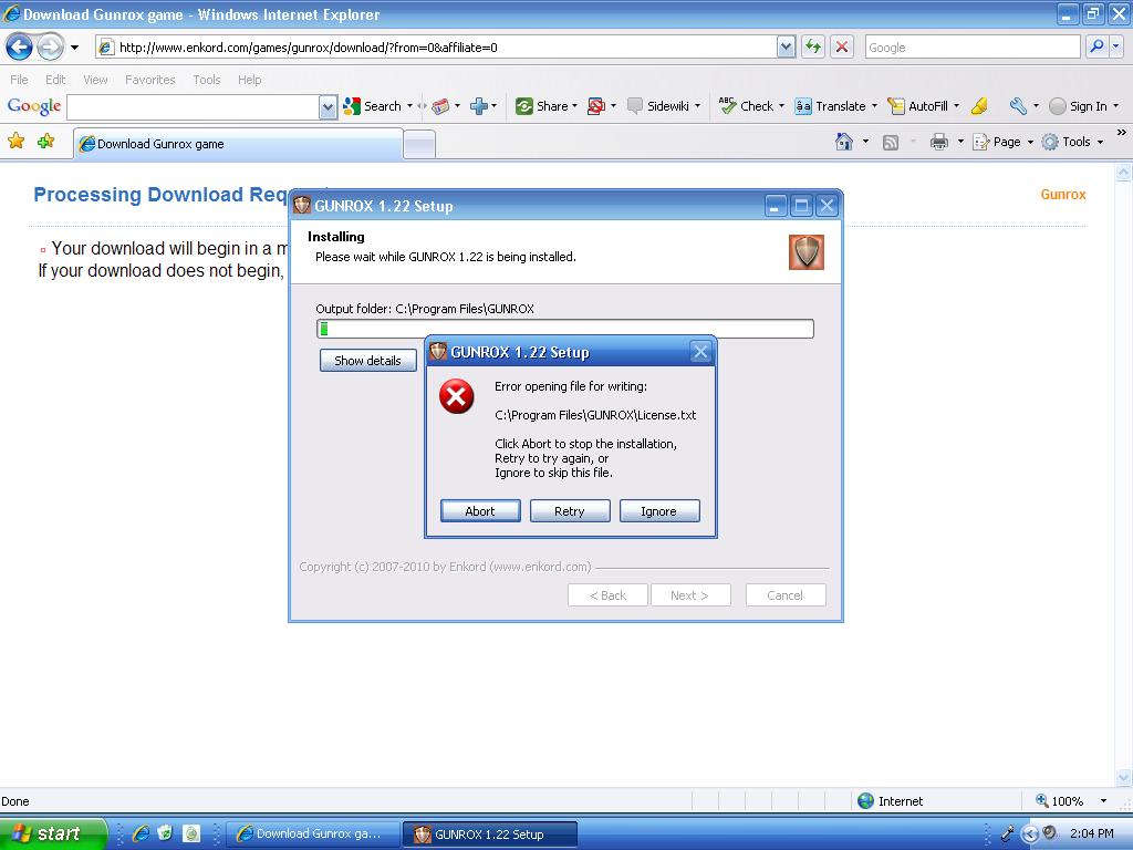 Tried to install Gunrox on my new computer, but there is an error, saying it cannot download "C:\ProgramFiles\GUNROX\License.txt".