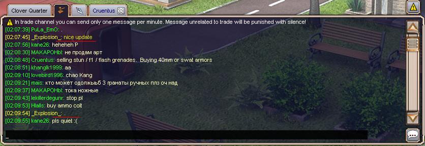 - Trade channel added that is common for all locations. You are able to post in it only one message per minute. From now on all trade messages outside of trade channel will result in silence!